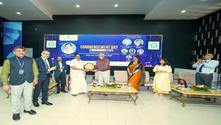 A special presentation on the Rajadhani Business School was given by Mr. Shinu R., Assistant Professor and Commencement Day Coordinator, offering a detailed overview of the school’s offerings and academic philosophy. The Chief Guests were felicitated by Dr. Biju Ramesh and Ms. Megha B. Ramesh as a token of appreciation for their valuable time and contribution.