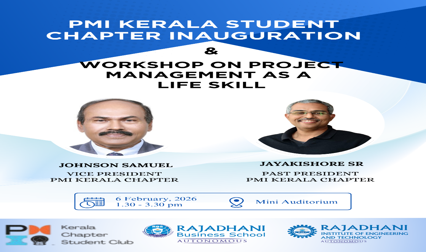 The Inauguration of the PMI Kerala Student Chapter was successfully conducted at RIET, followed by a workshop on Project Management as a Life Skill. The program began with a Welcome Address by Ms. Vidhya S., Assistant Professor, RBS , Mr. George Thomas, Director, RBS, offered the Special Address.