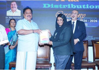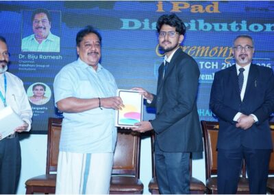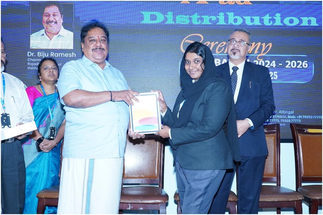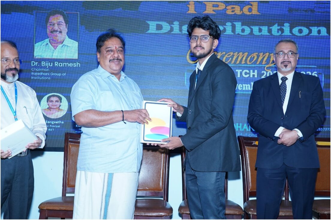 The event was graced by the Hon. Chairman, who officially distributed the iPads to all MBA students. The ceremony was held in the esteemed presence of Dr. Madhukumar S (Principal, RIET), Sri Rajit Karunakaran (Director, IDSM), and Dr. Cino Joseph (HoD In-Charge, RBS).